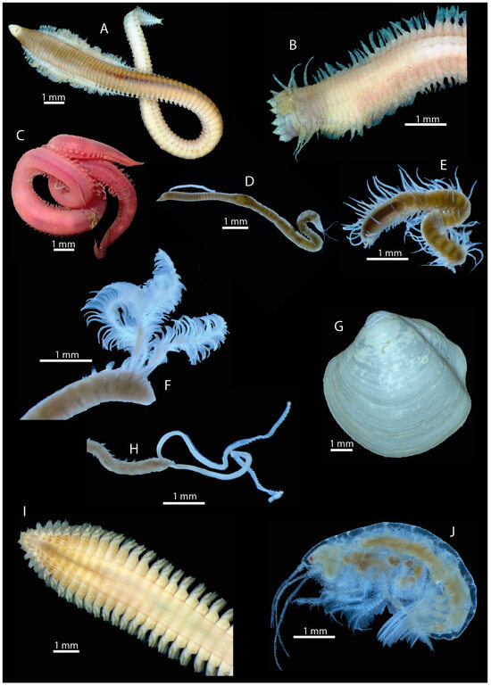 Key species of the oxygen minimum zone: Ninoe chilensis (A), Sigambra bassi (B), Glycera sp. (C), Cossura chilensis (D), Syllidae (E), Paraprionospio pinnata (F), Thyasira tomeana (G), Magelona phyllisae (H), Nephtys ferruginea (I) and Ampelisca araucana (J).