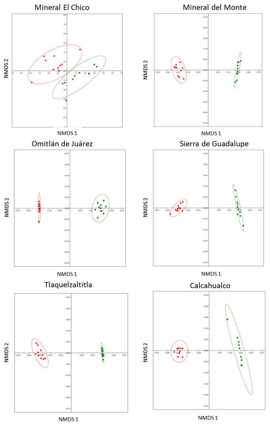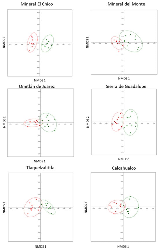 We documented significant differences in the composition of the defensive chemistry between leaves with and without cynipid-induced galls in each of the six localities. This showed that the chemical composition in terms of presence and concentration of SMs differed significantly between treatments (Figure 2) in Mineral El Chico (ANOSIM: r = 0.5884, n = 20, p < 0.0001); Mineral del Monte (ANOSIM: r = 0.99, n = 20, p < 0.0001); Omitlán de Juárez (ANOSIM: r = 0.9863, n = 20, p < 0.0001); Sierra de Guadalupe (ANOSIM: r = 1, n = 20, p < 0.0001); Tlaquetzaltitla (ANOSIM: r = 1, n = 20, p < 0.0001); and Calcahualco (ANOSIM: r = 0.981, n = 20, p < 0.0002).