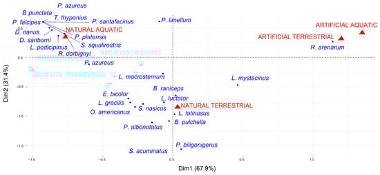 The correspondence analysis (Figure 2) revealed associations between species and habitat types, explaining 99.3% of the total variance in the first two dimensions. In sum, 10 species were strongly associated with natural aquatic habitats, while 14 species were moderately associated with natural terrestrial habitats. In contrast, R. arenarum was primarily associated with artificial habitats. The multiple correspondence analysis of the natural habitat (Figure 3) explained 12% of the total variance in the first two dimensions. In the natural aquatic habitat, the species D. nanus was associated with the floating macrophyte microhabitat, while R. dorbignyi was linked to the water microhabitat, both related to reproductive activity. In the natural terrestrial habitat, the grass microhabitat was associated with other activities. The multiple correspondence analysis of the artificial habitat (Figure 4) explained 18.9% of the total variance in the first two dimensions, so we used the best-represented variables to interpret the graph. The species L. limellum and L. mystacinus were associated with the bare ground microhabitat and sheltering activity. On the other hand, R. arenarum was linked to impermeable surfaces, while L. macrosternum was associated with the water microhabitat, both related to reproductive activity and artificial aquatic habitats.