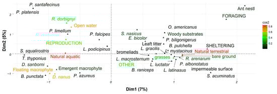 Multiple correspondence analysis relating species to the microhabitat used and the activity performed at the time of observation in the natural habitat. The color of the names indicates the cos² value, reflecting the quality of representation of each species or category in the selected dimensions. Higher values (red, yellow, orange) indicate better representation, while lower values (light to dark green) suggest greater contribution in other, non-visualized dimensions.