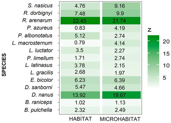 Species preferences for habitat and microhabitat. Higher z-values indicate greater habitat and microhabitat selectivity.