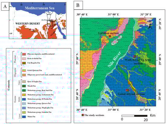 (A) Location map of Egypt; (B) geologic map showing the studied sections (modified after Conoco [51] and Abu Bakr et al. [46]).