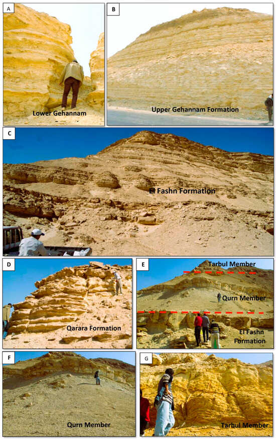 (A,B) Lower and upper parts of the Gehannam Formation in Garabaa section; (C) the El Fashn Formation in Gabal Abyiad section; (D) the Qarara formation in Gabal Abyiad section (E) the El Fashn Formation, the Qurn and the Tarbul members of the Beni Suef Formation in Wadi Bayad El Arab section; (F,G) the Qurn and the Tarbul members of the Beni Suef Formation in Wadi Bayad El Arab section.