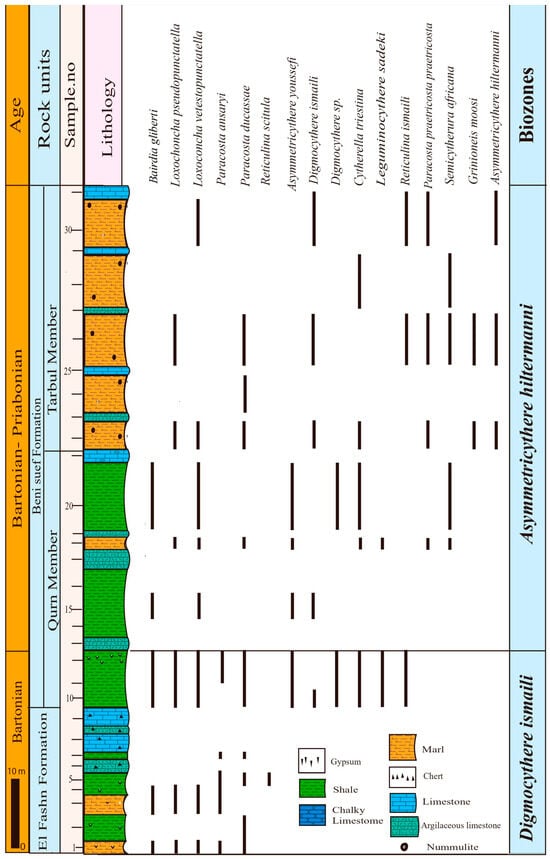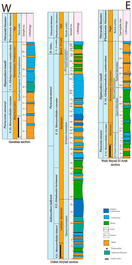 The El Fashn Formation was first introduced by Bishay [52] for the sedimentary succession exposed at Wadi El Sheikh, southeast of El Fashn City. This formation is fully exposed in the Gabal Abyiad section, with a thickness of 86 m, while its upper part is only exposed in the Wadi Bayad El Arab section, where it attains a thickness of about 22 m. In the Gabal Abyiad section, this rock unit overlies the Qarara Formation, and its lower part, measuring 26 m, mainly consists of greenish-gray shales with thin intercalations of egg-yellow marls and yellowish-white limestones (Figure 2C). The middle part consists of intercalations of yellowish-gray marls, snow-white chalky limestones, and yellowish-white limestones, with a thickness of 27 m. The upper part, which is 33 m thick, is composed of scarp-forming light-gray to snow-white limestones, with a yellowish-gray marly bed in the middle (Figure 3). The El Fashn Formation in the Gabal Abyiad section is dominated by well-preserved and highly diversified ostracod assemblages, represented by 42 species belonging to different genera, such as Paracosta, Leguminocythere, Cativella, Reticulina, Xestolebris, Asymmetricythere, Digmocythere, Loxoconcha, Bairdia, Cytheropteron, Cytherella, Schizocythere, Paracypris, and Paracytheridea. It is also characterized by the rare presence of species from genera such as Buntonia, Hornibrookella, Semicytherura, Eucytherura, Martinicythere, Bradleya, Grinioneis, Novocypris, Krithe, Uroleberis, Actinocythereis, and Acanthocythereis. In the Wadi Bayad El Arab section, this formation is overlain by the Beni Suef Formation and consists of yellowish-gray shales and light-gray marls in the lower part, followed upward by yellowish-white, scarp-forming marly to argillaceous limestones (Figure 2E). The exposed portion of this rock unit is characterized by less diversified, but abundant, ostracod assemblages, including the following species: Loxoconcha vetustopunctata, Loxoconcha pseudopunctata, Bairdia gleberti, Paracosta ducassae, Paracosta ansaryi, and Reticulina scitula. The high abundance of marker planktonic foraminiferal species, such as Orbulinoides beckmanni, and species related to the genera Morozovelloides, Turborotalia, Acarinina, Globigerinatheka, and Streptochilus, along with the presence of small and large benthic foraminifera, supports a Bartonian age for this rock unit [30,46,54,56,57,58,59].