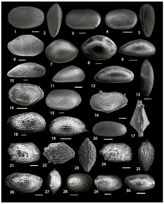 (LC = left carapace, RC = right carapace, DV = dorsal view, VV = ventral view). (1, 2) Cytherella triestina Kollmann, 1962 (1 LC, 2DV); (3) Cytherella kozialis Sonmez-Gokcen, 1973 (LC); (4, 5) Cytherella tarabulusensis El-Waer, 1992 (4 LC, 5 DV); (6) Bairdia cerbra Deltel, 1963 (RV); (7) Bairdia crolifai Morsi, Boukhary and Strougo, 2003 (LC); (8) Bairdia gliberti Keij, 1957 (LC); (9) Paracypris tarabulusensis El-Waer, 1992 (RV); (10) Paracypris eskeri El-Waer, 1992 (RV); (11) Paracypris buisae El Waer, 1992 (RV); (12, 13) Novocypris eocenana Ducasse, 1967 (12 RC, 13 DV); (14) Digmocythere ismaili Bassiouni, 1971 (LC); (15) Digmocythere omarai Cronin and Khalifa, 1979 (LC); (16, 17) Pterygocythereis minor Bassiouni, 1971 (16 LC, 17 DV); (18) Leguminocythereis africana Bassiouni, 1969c (RC); (19) Leguminocythereis sadeki Bassiouni, 1969c (LC); (20) Krithe bartonensis Jones, 1857 (LC); (21–25) Schizocythere fadlensis Cronin and Khalifa, 1979 (21, 22, 24 RC, 23 DV, 25 VV); (26, 27) Loxoconcha pseudopunctatella Cronin and khalifa, 1979 (26 LC, 27 DC); (28) Loxoconcha vetustopunctatella Bassiouni et al. 1984 (LC); (29) Loxoconcha mataiensis Khalifa and Cronin, 1979 (RC); (30) Loxoconcha tarabulusensis El-Waer, 1992 (RC). Scale bar: 100 µm.