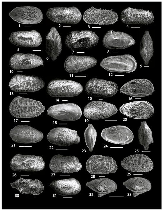 - Moore, R.C. (Ed.) Treatise on Invertebrate Paleontology, Part Q: Arthropoda 3—Crustacea, Ostracoda; University of Kansas Press: Lawrence, KS, USA, 1961; pp. 1–442. [Google Scholar]