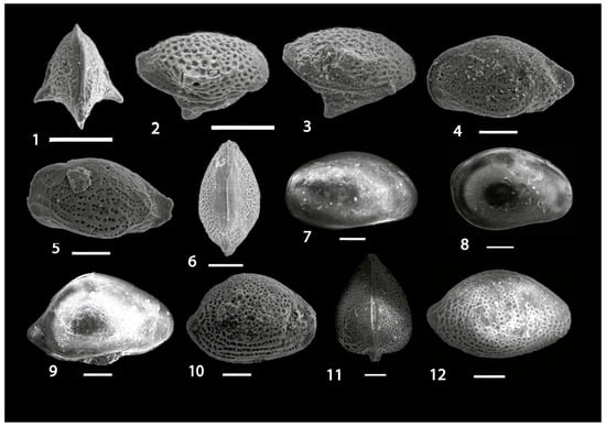 (1) Cytheropteron boukharyi Khalifa and Cronin, 1979 (DV); (2, 3) Cytheropteron tarabulusensis El-Waer, 1992 (RC); (4–6) Semicytherura africana El-Waer, 1992 (4, 5 LC, 6 DV); (7) Xestoleberis ghalilae El-Waer, 1992 (LV); (8) Xestoleberis subglobosa Bosquet, 1852 (LV); (9) Uroleberis curta Boukhary et al., 1993 (RV); (10–12) Uroleberis striatopunctata Ducasse, 1967 (10, 12 RV, 11 DV). Scale bar: 100 µm.