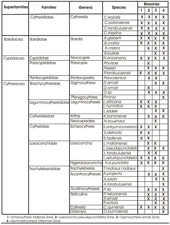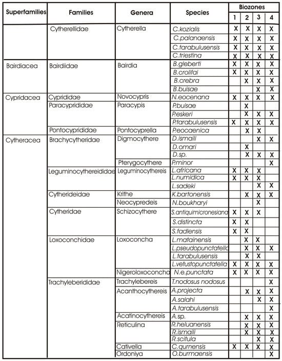 Ostracods groups (superfamilies, families, genera, species) and their stratigraphic distribution in the recorded biozones.
