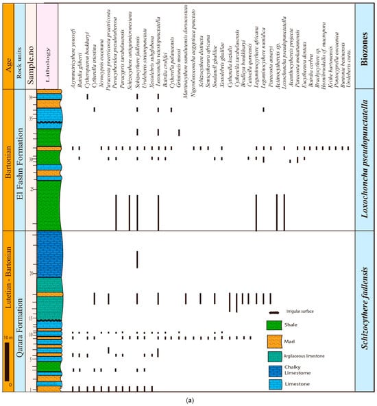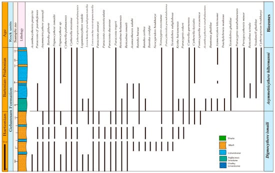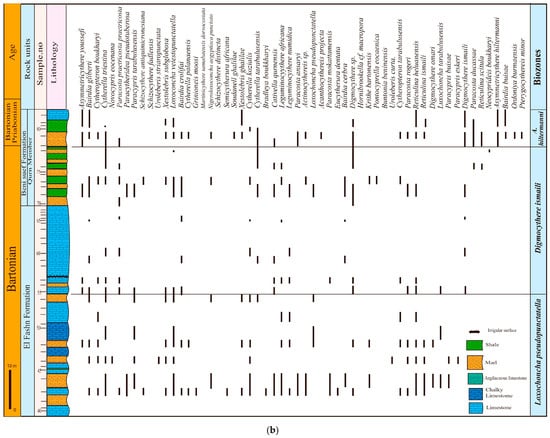 - Main taxa: Forty-eight ostracod species and subspecies are recorded in this zone. Five species have their first occurrence in this zone and are restricted to it: Paracypris buisae, Digmocythere omari, Buntonia bassiounni, Hornibroolella cf. macropora, Eucytherura dentata, and Uroleberis curta. Additionally, four species extend from the underlying zone and disappear in this zone: Schizocythere fadlensis, Schizocythere distincta, Bradleya boukharyi, and Urolebris striatopunctata. Meanwhile, sixteen species that occur in this zone have a stratigraphic distribution extending into the overlying zone, and the remaining ostracod species are transitional, i.e., they occur in this zone and extend from the underlying to the overlying zones (Figure 8a,b).