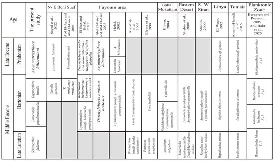 - Remarks and correlation: This zone is recorded in three studied sections. It correlates with the upper part of the El Fashn Formation and the lower part of the Qurn Member of the Beni Suef Formation at Gabal Abyiad section, measuring 38 m, and with the Wadi Bayad El Arab section, approximately 29 m thick, and also with the lower part of the Gehannam Formation at Garabaa sections (23 m thick). It is the stratigraphic equivalent of the standard middle Eocene planktonic foraminiferal Morozovelloides crassatus Zone [46,65,66]. It is equivalent to the upper part of the ostracod Loculicytheretta (Heptaloculites) cavernosa Zone that was recorded from the Bartonian of Libya [31] and Tunisia [36], as shown in Figure 11. In Egypt, the present zone is correlated with the upper middle Eocene (Bartonian) ostracod Reticulina heluanensis–Leguminocythereis sadeki Zone recorded from northwest Fayoum area [22], Cativella qurnensis Zone from northeast Beni Suef area [30], Cytherella alii Zone from Gabal Mokattam area [9], and Trachyleberis nodosus nodosus Zone defined from the Fayoum area [14,17], Abd El-Gaied and Abd El-Aziz [73], Gabal Mokattam area [76], and northeast Beni Suef area [11]. Moreover, this zone can be correlated with the upper part of the late middle–early late Eocene Asymmetricythere yousefi-Loxoconcha pseudopunctatella Zone recorded from the northwest Fayoum area [20], and to the upper middle Eocene Loxoconcha pseudopunctatella/Asymmetricythere asymmetrella Zone defined from the northwest region of the Eastern Desert [12], Asymmetricythere yousefi/Cytherella piacabucuensis Zone from southwest Sinai [68], and also the upper parts of the Costa humboldti Zone and the Costa Crassireticulata/Costa ducassae Zone that were defined from the Fayoum Depression [8,10] (Figure 11).