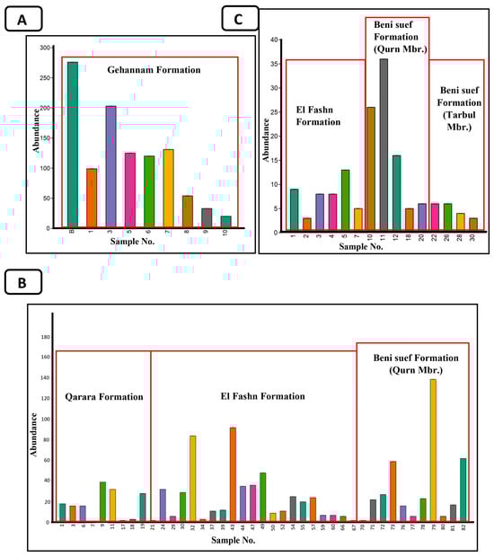 Histogram represents the abundance of the ostracod specimens ((A): Garabaa, (B): Gabal Abyiad, (C): Wadi Bayad El Arab).