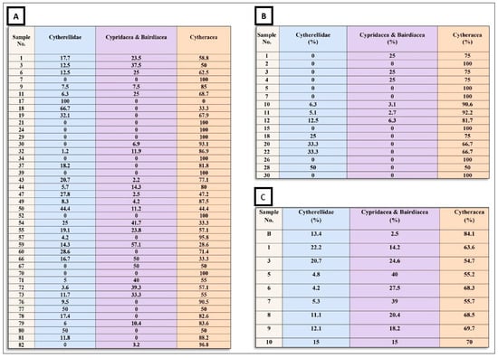 The percentage of the ostracod groups (Cytherellidae %, Cypridacea and Bairdiacea%, and Cytheracea %) in the studied sections, (A) Gabal Abyiad section; (B) Wadi Bayad El Arab section; (C) Garabaa section.