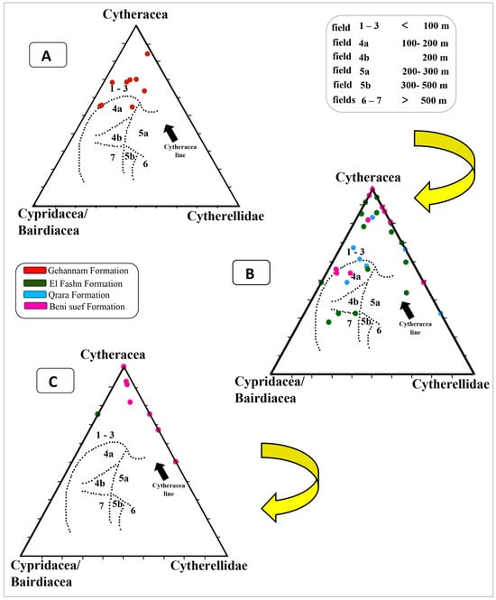 The ostracod assemblages are used to identify the paleodepths and environmental conditions that prevailed during the deposition of the studied rock units, as these faunas occur in various aquatic environments at different depths. Furthermore, the dominance, scarcity, or disappearance of ostracod species with known ecological preferences provides insights into changes in the depositional settings. For this purpose, the abundance and diversity of the ostracod assemblages in the studied samples are calculated and presented in the prepared histogram (Figure 12). Additionally, the percentages of the different ostracod groups (Cytherellidae %, Cypridacea %, Bairdiacea %, and Cytheracea %) are calculated, as shown in Figure 13. The Ternary Diagram of Dingle [69], which is subdivided into seven fields, was also applied to estimate the water depths for each rock unit (Figure 14).