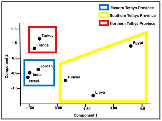 The paleobiogeographic reconstruction of the middle and late Eocene ostracods is mainly based on multivariate analysis (principal component analysis and Q-mode clustering), using a dataset comprising thirty-five ostracod species from eight countries, including Egypt, Libya, Tunisia, Jordan, India, Israel, France, and Turkey (Table 1). The PCA identified three provinces: the first is the Southern Tethys Province (STP), encompassing Egypt, Libya, and Tunisia; the second represents the Northern Tethys Province (NTP), including France and Turkey; and the third refers to the Eastern Tethys Province (ETP), comprising Jordan, Israel, and India (Figure 15). The obtained PCA bioprovinces are presented in the first two principal component axes, which account for 69.22% of the total variance (48.11% and 21.11%, respectively), as shown in Table 2.