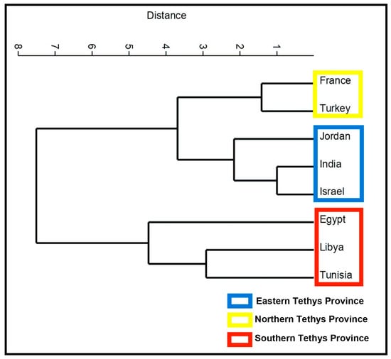 Q-mode cluster analysis showing the relationship between the study area in Egypt and other Tethys countries.