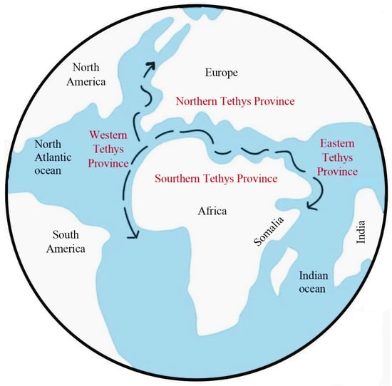 The paleobiogeographic map during the middle and late Eocene (after Shahin et al. [12]).