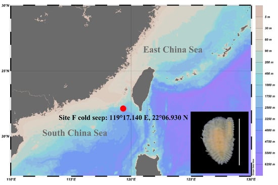 Sampling location of P. shinkai at Site F in the South China Sea marked by the red dot. The inset at the lower right shows a photograph of P. shinkai, with the larger specimen representing the female and the smaller one representing the male. The scale bar represents 1 cm.