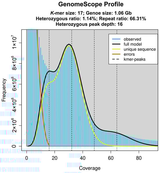 - Vurture, G.W.; Sedlazeck, F.J.; Nattestad, M.; Underwood, C.J.; Fang, H.; Gurtowski, J.; Schatz, M.C. GenomeScope: Fast reference-free genome profiling from short reads. Bioinformatics 2017, 33, 2202–2204. Available online: http://genomescope.org/ (accessed on 9 January 2025). [CrossRef]