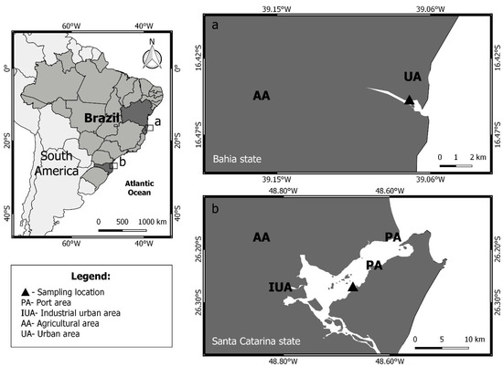 Map of the study areas: (a) Porto Seguro Estuary, tropical region of northeastern Brazil; (b) Babitonga Bay Estuary, subtropical region of southern Brazil.