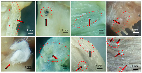 Examples of particulate pollutants found adhered to the gastrointestinal tracts (top row) and gills (bottom row) of Sphoeroides from both estuaries. Red circles and arrows showing the region and the particulate pollutant, respectively.