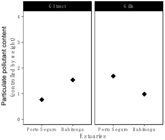 The analysis of the amount of particulate material in each biological sample, for each estuary, revealed that the debris content was significantly higher in the gastrointestinal tracts of fish from Babitonga Bay compared to those from Porto Seguro, while the opposite was observed for the gills, where Porto Seguro showed a higher number of particles compared to Babitonga Bay (Table 1). This interaction was statistically significant (F1,72 = 16.510, p < 0.001). However, no significant main effects were found for estuary (F1,72 = 0.077, p = 0.782) or organ (F1,72 = 2.801, p = 0.098, Figure 3).