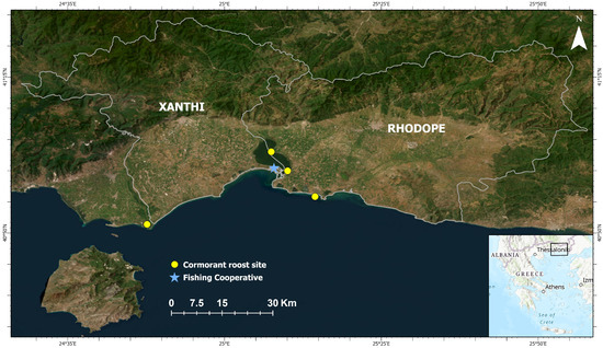 This study was carried out in the prefectures of Xanthi and Rhodope, Thrace, northern Greece (Figure 1), with a population of about 238,000 people, having 51.4% female/48.6% male and 27.1% higher and 72.9% lower education ratios [51]. Cormorants overwinter in the area’s lakes and lagoons in considerable numbers, ranging from 1000 birds in October to over 10,000 birds in November–January [18,52]. The target species uses four major sites for roosting in the area [18] (Figure 1). The local fishery, one of the most productive in Greece, is run by the Vistonis Fishing Cooperative, which has 52 members. The fishery is managed through the use of permanent barrier fish traps and wintering channels. The annual catch in different lakes and lagoons ranges from 40 to 230 kg ha−1, totaling between 600 and 700 tn [18]. Commercially important species include the flathead gray mullet (Μugil cephalus), golden gray mullet (Chelon auratus), thicklip gray mullet (Chelon labrosus), thinlip gray mullet (Chelon ramada), big-scale sand smelt (Atherina boyeri), European seabass (Dicentrachus labrax), gilthead seabream (Sparus aurata), and European eel (Anguilla anguilla).