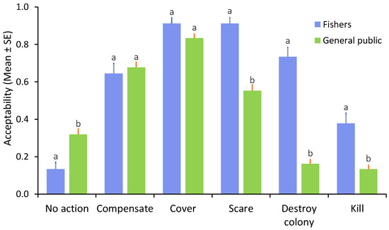 Overall, the use of nets to cover fish wintering channels was the most endorsed management strategy (85.7%), followed by compensation for damage (66.7%) and use of scaring devices (66.0%), while killing birds (20.7%), taking no action (26.3%), and destroying breeding colonies (33.3%) were the least endorsed strategies (χ2 = 210.733, df = 5, p < 0.001). Taking no action was more endorsed by the general public (mean 0.319 ± 0.032 SE) than by fishers (0.133 ± 0.041; p = 0.001) (Table 4, Figure 2). Scaring (p < 0.001), colony destruction (p < 0.001), and killing (p < 0.001) were more endorsed by fishers (0.911 ± 0.034, 0.733 ± 0.053, and 0.378 ± 0.058, respectively) than by the general public (0.552 ± 0.034, 0.162 ± 0.025, and 0.133 ± 0.024, respectively).