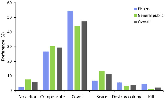 The use of nets for cover was the most prioritized among the management strategies by the respondents (47.3%), followed by compensation (29.3%), while killing (2.0%), colony destruction (4.0%), and taking no action (6.0%) were the least prioritized strategies (χ2 = 291.360, df = 5, p < 0.001) (Figure 3). Between groups, the use of nets for cover, colony destruction, and killing were more prioritized by fishers (54.4%, 5.6%, and 4.4%, respectively) than the general public (44.3%, 3.3%, and 1.0%, respectively), while taking no action, compensation, and scaring were more prioritized by the general public (7.6%, 30.5%, and 13.3%, respectively) than fishers (2.2%, 26.7%, and 6.7%, respectively) (χ2 = 11.833, df = 5, p = 0.037).