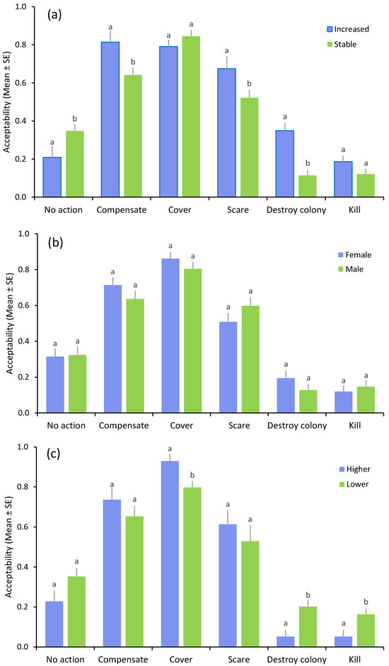 Effect of perceived population status (a), gender (b), and educational level (c) on the endorsement (mean ± SE) by the general public (n = 210) of strategies for managing fish predation by the great cormorant. Different letters between two groups in each strategy denote a statistically significant difference (logistic regression; p < 0.05).
