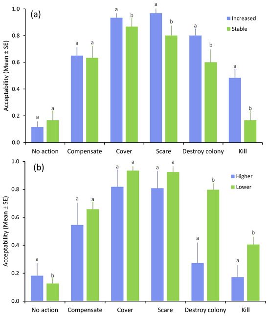 Effect of perceived population level (a) and educational level (b) on the endorsement (mean ± SE) by fishers (n = 50) of strategies for managing fish predation by the great cormorant. Different letters between two groups in each strategy denote a statistically significant difference (logistic regression; p < 0.05).