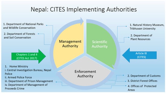 The latest publication by Nepal’s Department of National Parks and Wildlife Conservation (DNPWC), published in 2018/19, lists 73 mammals, 113 birds, 29 reptiles, 2 amphibians, 3 butterflies, and 417 plants native to Nepal and listed in CITES, again excluding all species of cycads and orchids listed in Appendix II [51]. Nepal is a member of SAWEN, which is a regional inter-governmental body with the mission to strengthen, promote, and coordinate regional cooperation to combat illegal wildlife trade with eight South Asian countries (Afghanistan, Bangladesh, Bhutan, India, Maldives, Pakistan, and Sri Lanka) [55]. Nepal has also formed the Wildlife Crime Control Coordination Committee at the ministerial level to combat illegal wildlife trade at the National level with the Wildlife Crime Control Bureau, Wildlife Crime Control Unit, and community-based anti-poaching units at the regional and community levels [31]. Here, we review aspects of Nepal’s older conservation-related laws, the caveats of Nepal’s relatively new CITES Act, 2017 [56], and discuss the roles and limitations of the CITES-appointed national authorities.