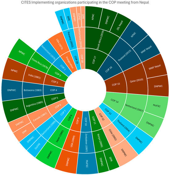 Participation of Nepal in CITES CoP showing the CoP number, date, where it took place, and which Nepalese offices sent participants. Note: NPWC—National Parks and Wildlife Conservation Office, DNPWC—Department of National Parks and Wildlife Conservation, DoFPR—Department of Forests and Plant Research, DMP—Department of Medicinal Plants, NTNC—National Trust for Nature Conservation, MoFSC—Ministry of Forests and Soil Conservation, DPR—Department of Plant Resources, WWF Nepal—World Wildlife Fund Nepal, DoFSC—Department of Forests and Soil Conservation, ZSL—Zoological Society of London Nepal Chapter.