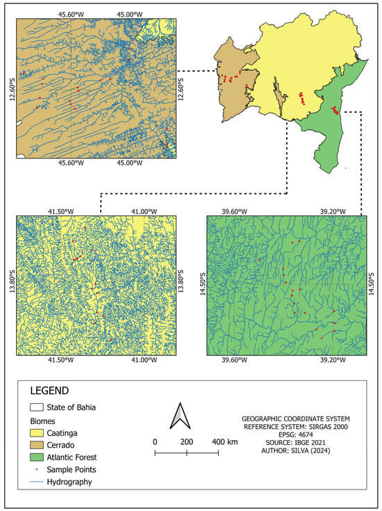 Map of the state of Bahia showing the divisions of the Atlantic Forest, Caatinga, and Cerrado biomes and an enlargement of each region showing the collection points in each area. This figure provides an overview of the state and specific enlargements of each biome, illustrating the distribution of sampling points in relation to the hydrographic network (in blue) and the biome coverage.