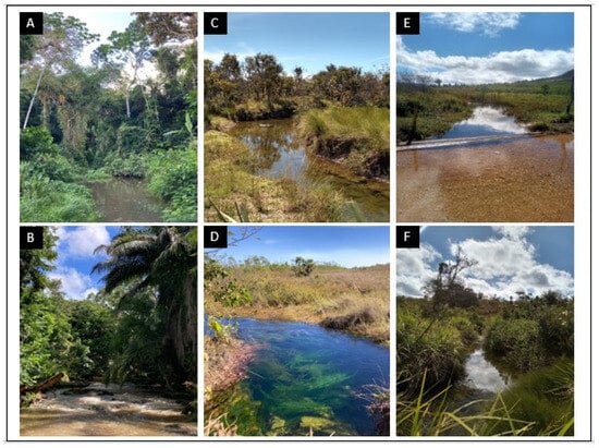 Images of some of the streams sampled in different biomes of the state of Bahia, Brazil. (A,B) Streams located in the Atlantic Forest, characterized by dense forest cover and shaded banks. (C,D) Streams in the Cerrado, with campo vegetation and open areas, and waters that are often clearer with the presence of aquatic macrophytes. (E,F) Streams in the Caatinga, with more exposed banks, sparse vegetation, and generally shallower waters.