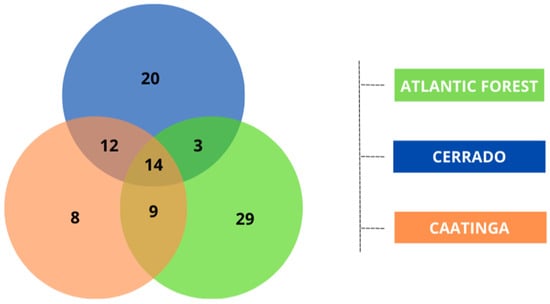 Venn diagram illustrating the number of species exclusive to each biome (Atlantic Forest, Cerrado, and Caatinga) and the species shared between two or among all three biomes evaluated. This diagram highlights the uniqueness and the overlap in species composition across the different environments studied.
