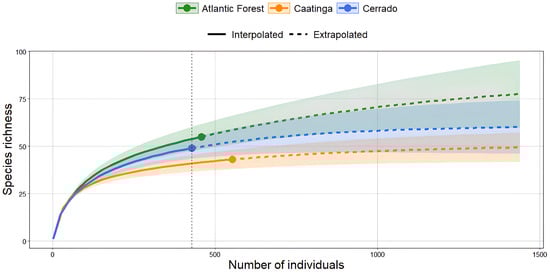 Rarefied (or interpolated) richness of Odonata species among the sampled areas of the Atlantic Forest, Cerrado, and Caatinga. The Atlantic Forest and Cerrado showed extrapolated richness values of 87.32 and 61.04 species, respectively, while the Caatinga showed an extrapolated richness of 50.98 species. The dashed vertical line represents the minimum standardized abundance value among the sampled areas.