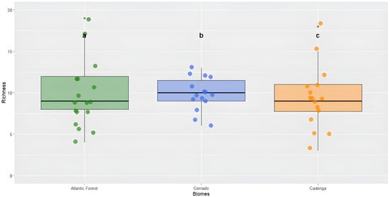 When comparing the observed richness among the three phytophysiognomic domains, the results showed that there was no significant difference among the biomes (χ2 = 0.933, df = 2, p = 0.627). The Caatinga exhibited a richness variation from 4 to 19 species with a mean of 9.7. The Cerrado showed a variation from 6 to 13 species with a mean of 9.8, and the Atlantic Forest presented a variation from 3 to 18 species with a mean of 9.3 (Figure 5).