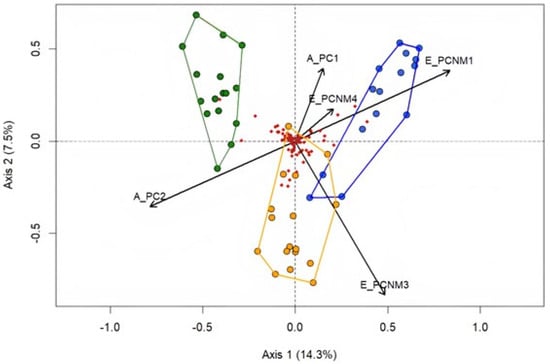 - Dray, S.P.; Legendre, P.; Peres-Neto, P.R. Spatial modelling, a comprehensive framework for principal coordinate analysis of neighbour matrices (PCNM). Ecol. Model. 2006, 196, 483–793. [Google Scholar] [CrossRef]