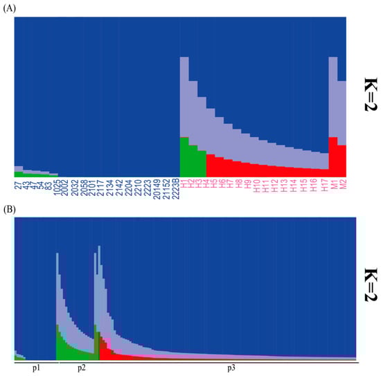 - Pritchard, J.K.; Stephens, M.; Donnelly, P. Inference of Population Structure Using Multilocus Genotype Data. Genetics 2000, 155, 945–959. [Google Scholar] [CrossRef]
