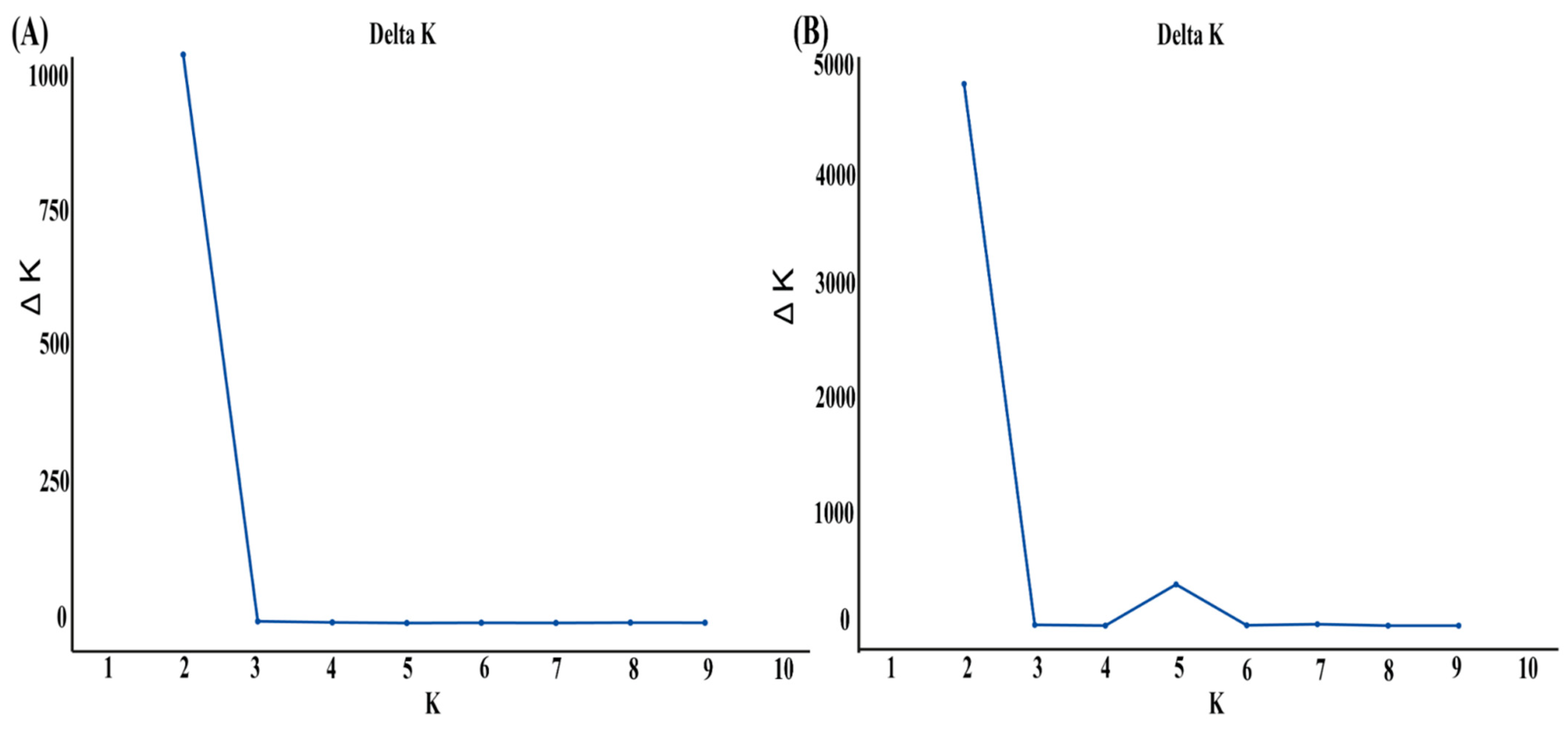 - Earl, D.A.; vonHoldt, B.M. STRUCTURE HARVESTER: A Website and Program for Visualizing STRUCTURE Output and Implementing the Evanno Method. Conserv. Genet. Resour. 2012, 4, 359–361. [Google Scholar] [CrossRef]