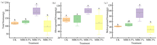 Effects of Spartina alterniflora-derived biochar on the biomass of Scirpus mariqueter: (a) total biomass, (b) aboveground biomass, and (c) belowground biomass. MBC0.5%, MBC1%, and MBC3% denote biochar application rates of 0.5%, 1%, and 3% (w/w), respectively, with control plots (CK) receiving no biochar amendment. Different lowercase letters indicate significant differences among treatments (p < 0.05).