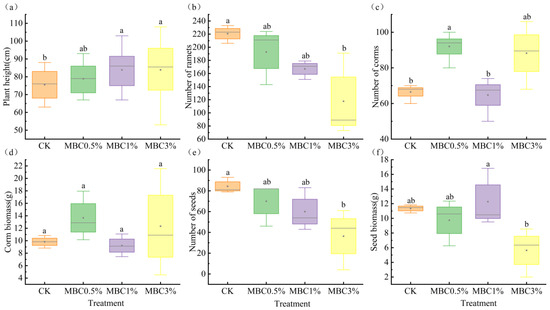 Effects of Spartina alterniflora-derived biochar on the vegetative and reproductive traits of Scirpus mariqueter: (a) plant height; (b) number of ramets; (c) number of corms; (d) corm biomass; (e) number of seeds; (f) seed biomass. Different lowercase letters indicate significant differences among treatments (p < 0.05).