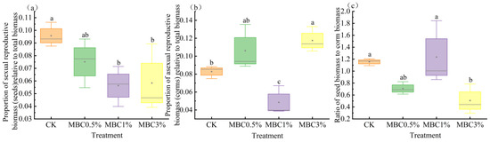 Effects of Spartina alterniflora-derived biochar on the reproductive allocation of Scirpus mariqueter: (a) proportion of seed biomass relative to total biomass; (b) proportion of corm biomass relative to total biomass; (c) ratio of seed biomass to corm biomass. Different lowercase letters indicate significant differences among treatments (p < 0.05).