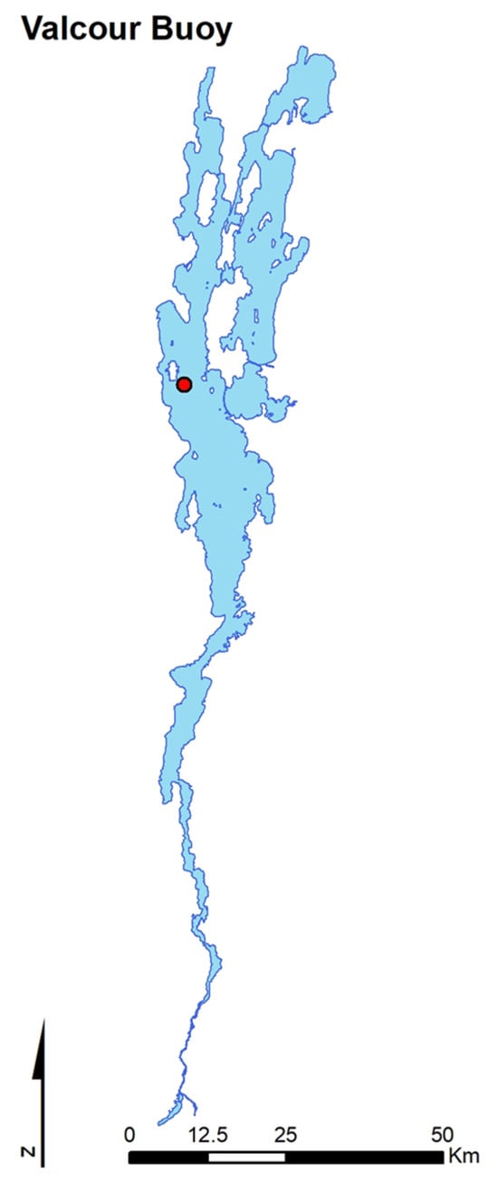 Samples were collected at a 50 m depth site at the SUNY Plattsburgh Lake Champlain Data Buoy just south of Valcour Island in the Main Lake segment of Lake Champlain (Figure 1). This site is used for intensive monitoring of lake thermal structure, with water column temperature profiles collected by the data buoy at 1–2 m depth intervals every 15 min.
