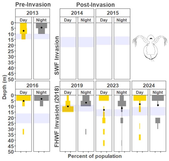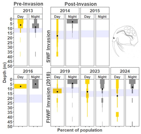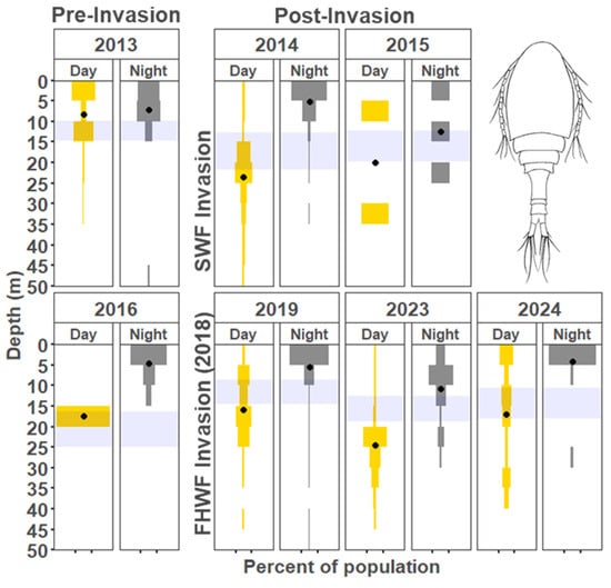 Another taxon with strong DVM-related impacts from the invasive predators was Mesocyclops edax. Individuals exhibited limited DVM in 2013 (pre-invasion), with the majority of the population occupying the epilimnion during both daytime and nighttime. There was a major increase in DVM during the 2014 Bythotrephes invasion year, when only 10% of the population inhabited the epilimnion during the day compared to 95% at night. Populations were greatly reduced in 2015 when Bythotrephes reached their peak abundance. Mesocyclops edax populations in 2016 migrated from the upper portion of the deep metalimnion (starting at 22 m) during the day to the top of the epilimnion at night. DVM occurred in 2019, following the Cercopagis invasion, with populations distributed in the 5–25 m depth strata of the water column during the day and 90% moving to the surface at night. Daytime DVM into the deep strata continued with high Cercopagis abundance in 2023 and 2024 (Figure 9).