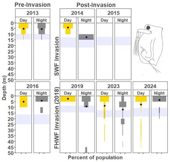 No more than half of the Bosmina longirostris population migrated during any of the sample dates. Bosmina longirostris DVM did not occur in the 2013 or 2016 reference years, where the entire population remained in the epilimnion. Approximately half of the population migrated below the epilimnion during the daytime in 2014 after the Bythotrephes invasion. There was no detectable population of B. longirostris at our sampling location in 2015 sampling during very high lakewide Bythotrephes abundance [9]. DVM was observed in 2019 when Cercopagis were present at high densities, with about 20% of the population in the epilimnion during the day versus 80% at night. In 2023, the population continued to exhibit DVM; individuals that remained in the hypolimnion at night occurred higher in the water column than during the day (Figure 2).