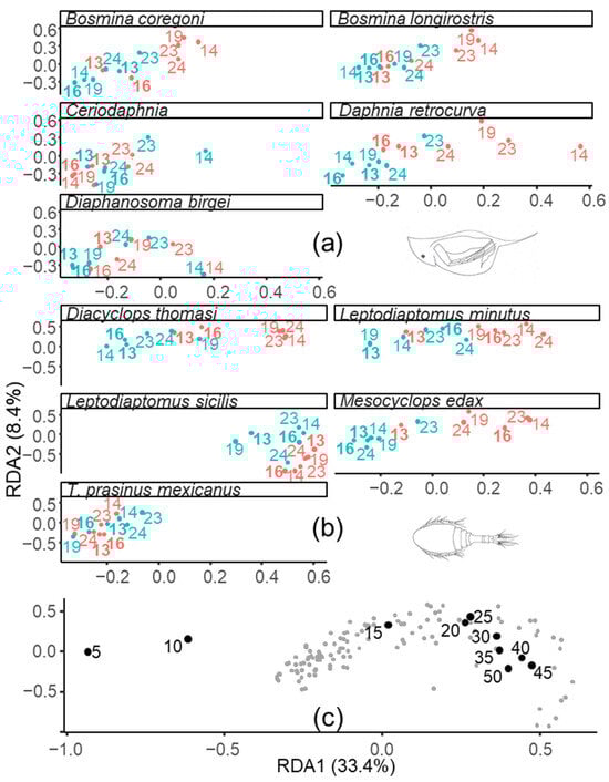 RDA ordination plot of Hellinger-transformed abundances at different depths separated by species for cladocerans (a) and copepods (b). Species, period (day/night), and year were set as categorical constraints. Orange- and blue-colored points represent daytime and nighttime samples, respectively. Each sample is labeled with the last two digits of its corresponding year. Bolded labels (13 and 16) for each species represent years prior to cercopagid invasions. The bottom panel (c) shows how depth was influenced by the categorical constraints (gray points). Note the differences in scale for each panel.