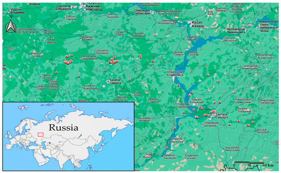 The Middle Volga region has a diverse landscape: coniferous and mixed forests in the north and steppe in the south. The central and largest part of the territory is occupied by forest-steppe [79]. The location of the region within the forest, forest-steppe, and steppe zones determines the high diversity of plants and animals. Thus, the flora of the Middle Volga region has about 2050 species of plants [80,81], and the fauna includes 11 species of amphibians, 14 species of reptiles, 300 species of birds, and 85 species of mammals [63,64,65,66,82,83,84,85,86]. A more detailed description of the Middle Volga region is given in our earlier work [87].