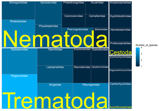 Data visualization was performed using the “R” programming language (R Core Team, Vienna, Austria) [95] with the “treemapify” [96] and “ggplot2” [97] packages. To determine the species diversity of helminths, the Shannon’s diversity index (H’) was calculated. The significance of differences between the index values was estimated using Student’s t-test [98]. The similarity of helminth compositions was evaluated using Morisita’s overlap index (Cm). The degree of similarity is as follows: 0–0.33—low; 0.34–0.66—medium; 0.67–1—high. Statistical data processing was performed using the PAST 2.16 (University of Oslo, Norway) [99].