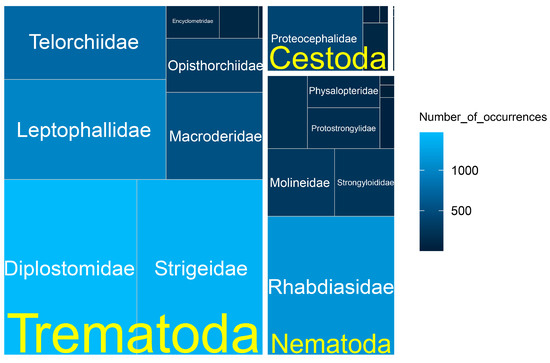 According to our database, trematodes are the predominant parasites of the studied reptiles and are represented by 21 species belonging to 10 families: Diplodiscidae, Encyclometridae, Leptophallidae, Macroderidae, Opisthorchiidae, Plagiorchiidae, Pleurogenidae, Telorchiidae, Diplostomidae, and Strigeidae (Figure 2). This set includes both adult (15 species) and larval (6) forms. Trematodes account for 66.7% (5719 records) of the total number of occurrence records (Figure 3).